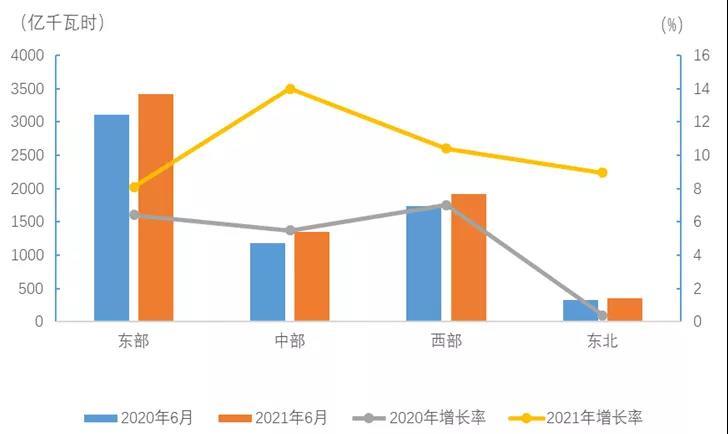 1-6月,東、中、西部和東北地區(qū)②全社會用電量分別為18581、7339、11195和2224億千瓦時,增速分別為17.7%、16.9%、14.8%和9.6%。