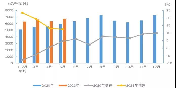 1-5月,全國全社會(huì)用電量32305億千瓦時(shí),同比增長(zhǎng)17.7%,其中,5月份全國全社會(huì)用電量6724億千瓦時(shí),同比增長(zhǎng)12.5%。