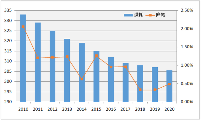 圖21 2010~2020年供電煤耗和降幅(單位:克/千瓦時(shí),%)