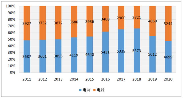 2020年全國(guó)電源基本建設(shè)投資占電力投資比重的53%,較上一年增加8個(gè)百分點(diǎn);電網(wǎng)基本建設(shè)投資占電力投資的比重為47%,較上一年降低8個(gè)百分點(diǎn)。