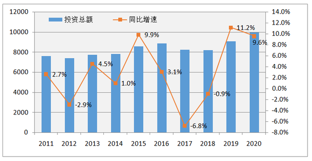圖17 2011~2020年全國(guó)電力投資總量及增速情況(單位:億元,%)