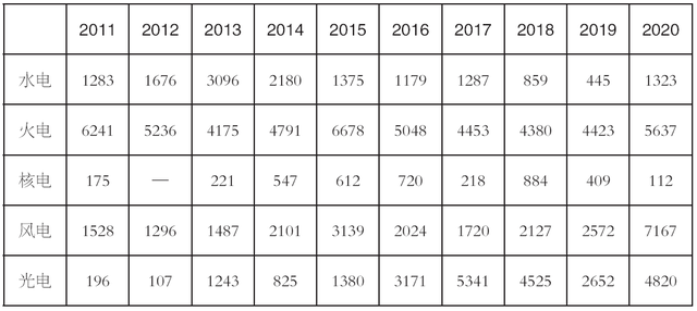 表4 2011~2020年各類(lèi)發(fā)電新增裝機(jī)情況(單位:萬(wàn)千瓦)