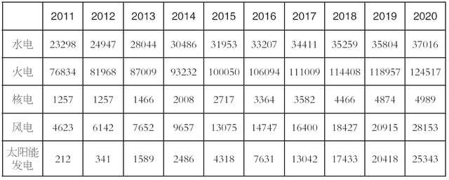 表3 2011~2020年全國(guó)電力裝機(jī)結(jié)構(gòu)(單位:萬(wàn)千瓦)
