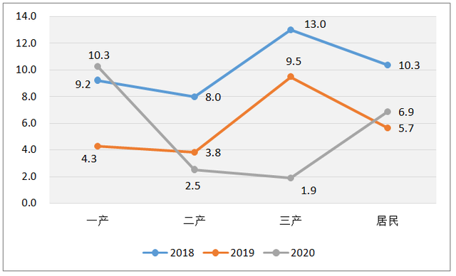 圖3 2018~2020年分產(chǎn)業(yè)用電量增速情況(單位:%)