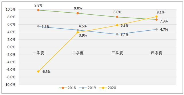 圖2 2018~2020年全國(guó)全社會(huì)用電量季度增速(單位:%)