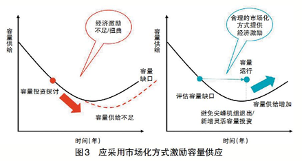 我國當(dāng)前處于容量市場起步階段,多地對于容量市場的構(gòu)建進(jìn)行了有益的探索,同時也暴露出一些問題。山東省將容量成本按照政府制定的容量補償價格從用戶側(cè)收取,參與電力現(xiàn)貨市場的煤電機(jī)組試行容量補償電價,標(biāo)準(zhǔn)暫定為0.0991元/千瓦時(含稅),每月按機(jī)組的折算容量進(jìn)行分配,已完成折舊的機(jī)組可獲得80%的補償,未完成折舊的機(jī)組可獲全部補償,檢修、非停等不可用容量要被扣除。容量補償能緩解一定經(jīng)營壓力,但這種贖買的方式無疑是有缺陷的,管制的靈活性滯后于市場調(diào)節(jié),政府預(yù)先制定的容量補償價格未必與市場行情相符,定價過高會增加用戶成本,定價過低則無法對發(fā)電商投資起到激勵作用,政策的變化也會使得市場在振奮和蕭條間來回波動,不利于市場的穩(wěn)定建設(shè)。因此,為了更好地激發(fā)容量市場活力,應(yīng)采用市場化的方式反映容量的價值,來避免系統(tǒng)需要的機(jī)組因為經(jīng)營虧損退出和激勵新的靈活性容量投資進(jìn)入(見圖3)。