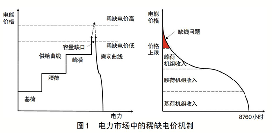 能量補償是指電力系統(tǒng)可靠性和電源投資水平由市場參與者根據(jù)電能量市場的價格信號而非規(guī)定的容量要求來確定,允許發(fā)電商通過尖峰時刻產(chǎn)生的稀缺電價回收成本并創(chuàng)造收益。理想的電力市場狀態(tài)下,需求對價格有著及時的反應(yīng),供應(yīng)不足時價格就會上漲,直到有足夠的容量來滿足負(fù)荷需求,且滿足負(fù)荷需求的所有容量都按照尖峰時刻的稀缺電價進(jìn)行結(jié)算(見圖1左)。理論上講,稀缺電價機(jī)制需要的監(jiān)管干預(yù)措施是最少的,其市場設(shè)計也簡單透明,這樣所有的容量不論有沒有被使用,其意義是一樣的,都是為了保證電力系統(tǒng)的可靠性和長期穩(wěn)定性而存在,需要投資建設(shè)足夠的容量來滿足尖峰負(fù)荷。