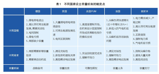 在全球多個運營的電力市場中,為確保發(fā)電容量充裕性采用的方法各不相同,并仍處于改進(jìn)完善甚至重新構(gòu)建的過程中。不同國家基于本國不同國情、不同需求(見表1),選擇不同的容量機(jī)制,典型的包括戰(zhàn)略備用、容量拍賣、可靠性期權(quán)、具有可交換證書的容量義務(wù)和容量支付(見表2)。