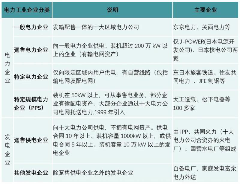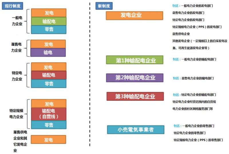 改革前日本的電力工業(yè)結(jié)構(gòu)(如表2所示)中電力企業(yè)分為一般電力企業(yè)(十大電力公司)、躉售電力企業(yè)(包括日本電源開(kāi)發(fā)公司和日本核電公司兩家)、特定電力企業(yè)(為特定區(qū)域用戶供電),特定規(guī)模電力企業(yè)(PPS)、躉售供電企業(yè)。為全面放開(kāi)用戶選擇權(quán),新法案對(duì)這些企業(yè)進(jìn)行了重新劃分。分為發(fā)電企業(yè)、輸配電企業(yè)(分為三類(lèi))和售電企業(yè),并規(guī)定了相應(yīng)的權(quán)力和義務(wù)。