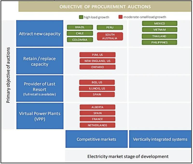 電力行業(yè)也廣泛地應(yīng)用各種各樣的拍賣方式作為交易方式,例如許多發(fā)展中國家就針對電廠和輸電資產(chǎn)的特許經(jīng)營權(quán)運(yùn)用了第一價格暗標(biāo)拍賣,而電力市場集中競價交易中常談到的統(tǒng)一出清以及按報價支付(Pay as Bid)實(shí)質(zhì)也是兩種拍賣方式,美國、西班牙、哥倫比亞等國則在容量市場采用“荷式時鐘拍賣”。