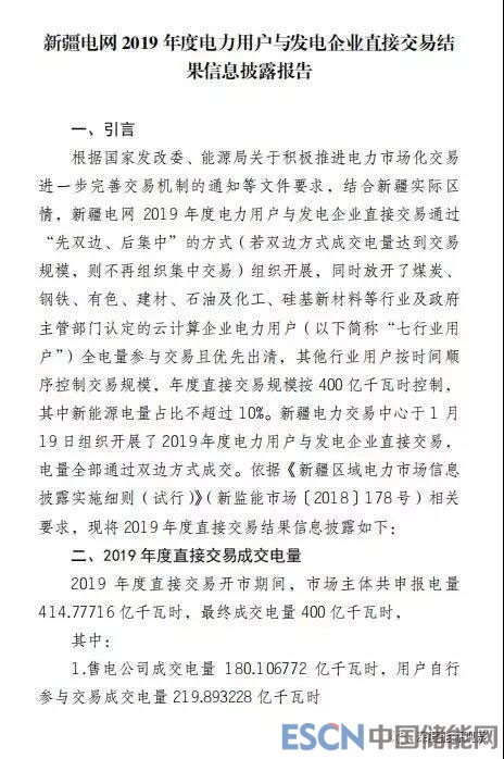 2月15日,新疆電力交易中心發(fā)布了《新疆電網(wǎng)2019年度電力用戶與發(fā)電企業(yè)直接交易結(jié)果信息披露報告》,2019年度直接交易開市期間,市場主體共申報電量414.77716億千瓦時,最終成交電量400億千瓦時,其中:售電公司成交電量180.106772億千瓦時,用戶自行參與交易成交電量219.893228億千瓦時。