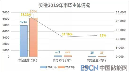 截止2019年2月,安徽電力市場準入的市場主體已增至6084家電力用戶,其中包括190家售電公司和28家發(fā)電企業(yè)。與2018年的4935家電力用戶、171家售電公司和25家發(fā)電企業(yè)相比,新增了電力用戶1149家、新增售電公司21家、新增發(fā)電企業(yè)3家。市場主體總數(shù)量同比增長23%,售電公司數(shù)量同比增長11.1%,發(fā)電企業(yè)同比2017年增長12%。