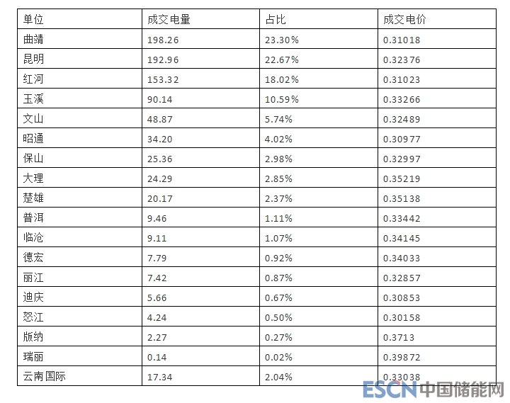 分地區(qū)來看,昆明、曲靖、紅河、玉溪地區(qū)用戶的市場化交易電量達634.68億千瓦時,占全部市場化交易電量的76.13%,其中曲靖地區(qū)成交198.3億千瓦時,占全部交易電量的 23.78%;昆明地區(qū)成交193億千瓦時,占全部交易電量的23.15%;紅河地區(qū)成交153.3億千瓦時,占全部市場化交易電量的18.39%;玉溪地區(qū)成交90.1億千瓦時,占全部市場化交易電量的10.81%。