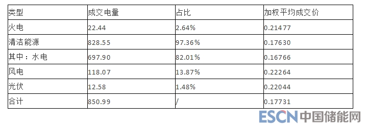 2018 年,市場化電廠在省內(nèi)市場累計成交電量 850.99 億千瓦時,同比增長 21.03%,以水電為主的清潔能源成交電量 828.55億千瓦時,占總成交電量的 97.36%,平均成交價每千瓦時0.17630元,其中,水電成交電量697.9億千瓦時,占總成交電量的82.01%,平均成交價每千瓦時0.16766元;風電成交電量118.07億千瓦時,占總成交電量的13.87%,平均成交價每千瓦時0.22264元;光伏成交電量12.58億千瓦時,占總成交電量的1.48%,平均成交價每千瓦時0.22044元。火電成交電量22.44億千瓦時,占總成交電量的2.64%,平均成交價每千瓦時0.21477元。