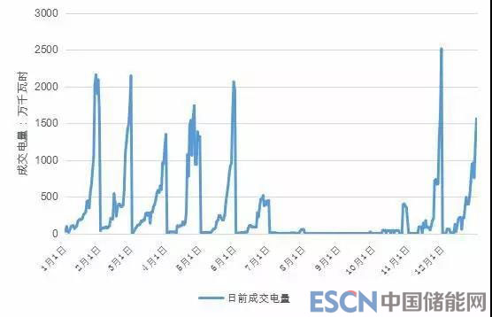 從每日成交情況來看,由于僅次日用電需求超出日前電量交易申報基準值的部分,才可參與日前電量交易,在月初的時候日前電量交易參與用戶數(shù)、電量規(guī)模往往較小,隨著時間推移,到月末時參與用戶數(shù)與交易規(guī)模均達到最高值。 2018年,最高成交電量發(fā)生在 11 月30日,成交電量2513萬千瓦時。2018年日前電量交易成交電量曲線如下圖所示。