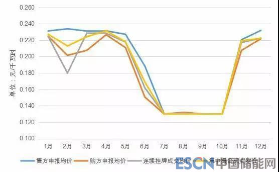 隨著市場規(guī)則的不斷完善和市場主體市場意識的不斷增強,2018年,大部分市場主體選擇通過雙邊協(xié)商的方式參與市場,集中撮合交易成交規(guī)模不斷縮減,成交電量占月度市場成交電量的比例較2017年降低 13.14個百分點,其中最高占比為2.04%(2月),最低僅占0.04%(10月)。雖然月度集中撮合交易市場占比進一步縮減,但是月度集中撮合交易依然發(fā)揮著發(fā)現(xiàn)市場價格信號的作用,主要體現(xiàn)在:一是雙邊交易中,很多市場主體以集中撮合交易平均成交價為“標桿”,按照約定的浮動機制來確定雙邊交易電量的最終成交價;二是連續(xù)掛牌交易中,市場主體通常將參考集中撮合交易平均成交價進行報價;三是售電公司的價格保底服務模式中,通常將用戶成交價低于集中撮合交易平均成交價作為收取交易服務費的前提條件。2018年,月度集中撮合交易平均成交價每千瓦時0.21540元,在枯平期的1至5月價格比較平穩(wěn),維持在每千瓦時0.22元左右,6月份由于開始進入雨季,市場普遍預期電量供給增加,交易平均成交價為每千瓦時0.169元,在主汛期7至10月份均為“地板價”每千瓦時0.13元,11、12月逐步回升至每千瓦時0.22205元。