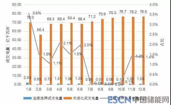 2018年,共有232家電力用戶(售電公司)參與申報,累計申報電量21.78億千瓦時;共167家電廠參與申報,累計申報電量321.96億千瓦時;全年連續(xù)掛牌交易累計成交電量10.18 億千瓦時,占省內(nèi)市場化成交電量的1.2%。