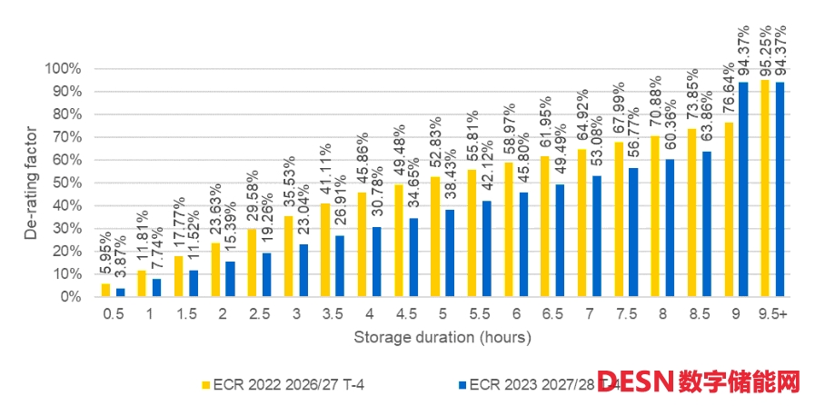 當(dāng)電力需求激增而供應(yīng)不足時,電網(wǎng)系統(tǒng)承受著巨大的運行壓力,容量市場將會向那些可用于能源調(diào)度的資源(例如儲能系統(tǒng))支付費用。這一費用的計算并非一概而論,而是根據(jù)資源在提供備用容量方面的“可靠性”進行加權(quán)。具體來說,資源的“可靠性”越高,其電價獲得的加權(quán)也就越大。對于某種能源來說,其拍賣中所獲得的最高電力價格百分比就是其“降級因素”。這既是對其技術(shù)性能的一種評價,也是對其在電力市場中競爭力的一種體現(xiàn)。