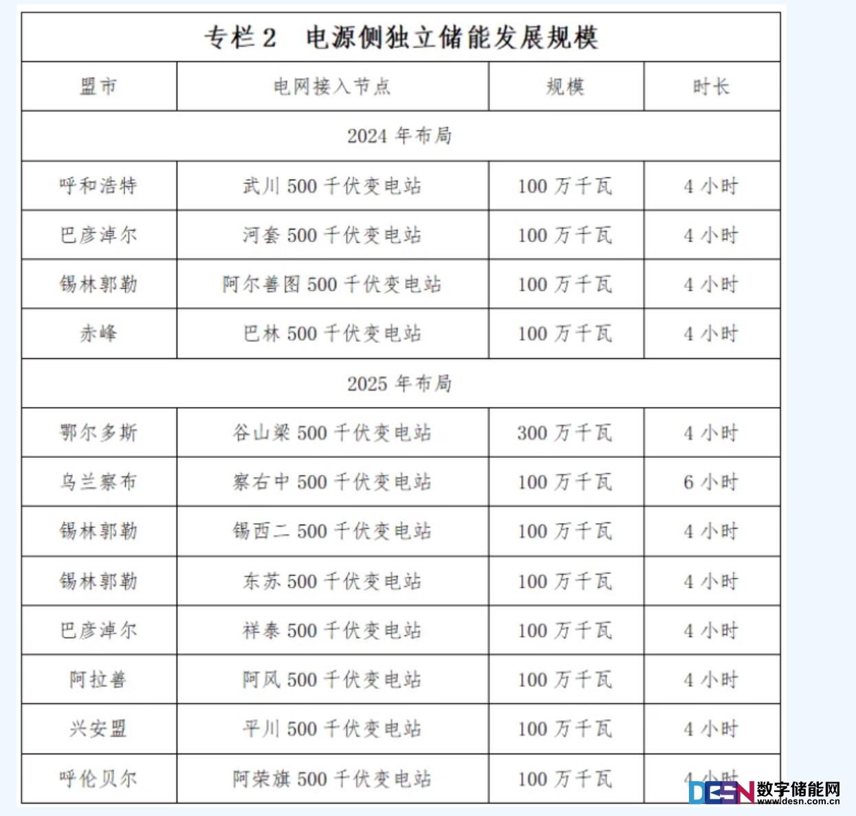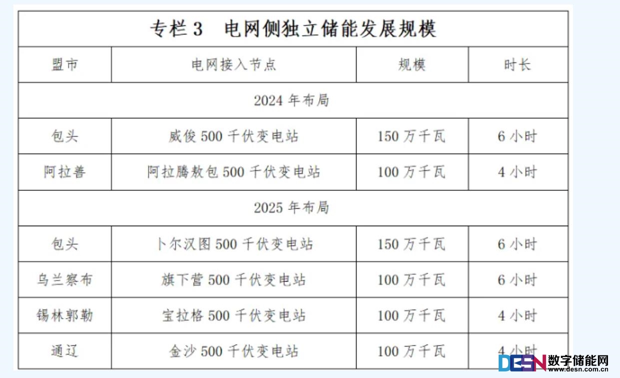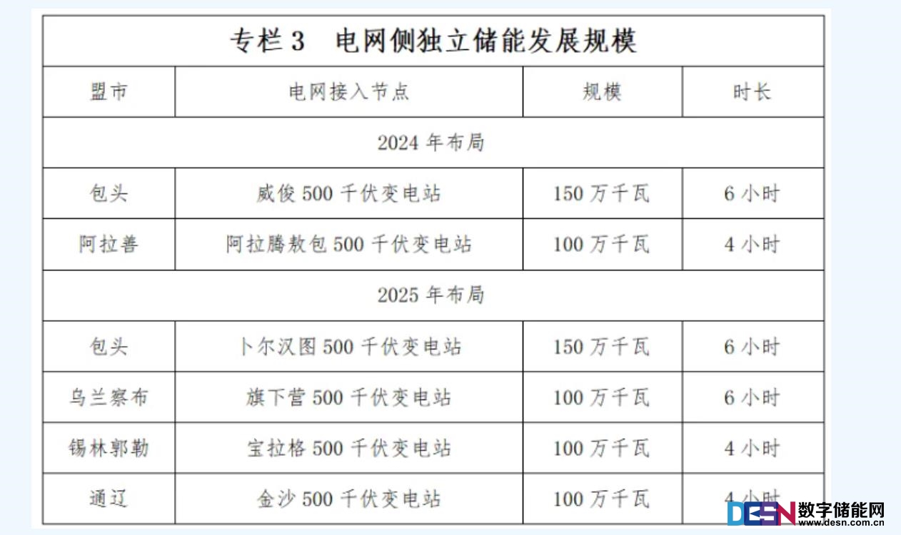 (二)推進(jìn)電網(wǎng)側(cè)獨(dú)立儲(chǔ)能建設(shè)。充分發(fā)揮容量支撐、調(diào)頻調(diào)壓、黑啟動(dòng)等作用,保障電力安全供應(yīng)和電網(wǎng)穩(wěn)定運(yùn)行,根據(jù)電網(wǎng)實(shí)際需求,重點(diǎn)在包頭卜爾漢圖、烏蘭察布旗下營、通遼金沙等電網(wǎng)關(guān)鍵節(jié)點(diǎn),集中建設(shè)電網(wǎng)側(cè)獨(dú)立儲(chǔ)能電站,提升系統(tǒng)調(diào)節(jié)能力、保障高峰用電需求、解決末端電網(wǎng)用電等作用。2024年,規(guī)劃建成電網(wǎng)側(cè)獨(dú)立儲(chǔ)能250萬千瓦/1300萬千瓦時(shí);2025年,建成電網(wǎng)側(cè)獨(dú)立儲(chǔ)能450萬千瓦/2300萬千瓦時(shí)。