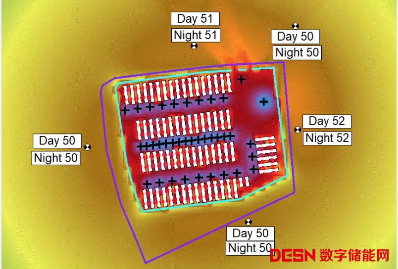 在電池儲(chǔ)能系統(tǒng)的設(shè)計(jì)階段,聲學(xué)顧問和技術(shù)專家需要準(zhǔn)確識(shí)別并確定來(lái)自各類設(shè)備的關(guān)鍵聲源。設(shè)備供應(yīng)商可能會(huì)提供有關(guān)產(chǎn)品噪音排放的詳細(xì)數(shù)據(jù),這些數(shù)據(jù)有時(shí)是基于對(duì)現(xiàn)有設(shè)施的實(shí)際場(chǎng)地測(cè)量得出的。利用這些數(shù)據(jù)構(gòu)建一個(gè)聲學(xué)模型,該模型能夠模擬電池儲(chǔ)能系統(tǒng)在其周邊(如住宅)產(chǎn)生的聲音水平。這個(gè)聲學(xué)模型不僅包含了電池儲(chǔ)能系統(tǒng)各個(gè)設(shè)備的聲源,還納入了周圍區(qū)域的地形特征。建模評(píng)估的最終結(jié)果將與工程項(xiàng)目所適用的噪音限制標(biāo)準(zhǔn)進(jìn)行對(duì)比。電池儲(chǔ)能系統(tǒng)的聲音建模分析示例的結(jié)果如下圖所示。
