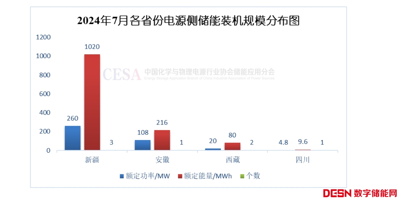 圖2-1-2 2024年7月各省份電源側(cè)新型儲(chǔ)能裝機(jī)規(guī)模分布圖