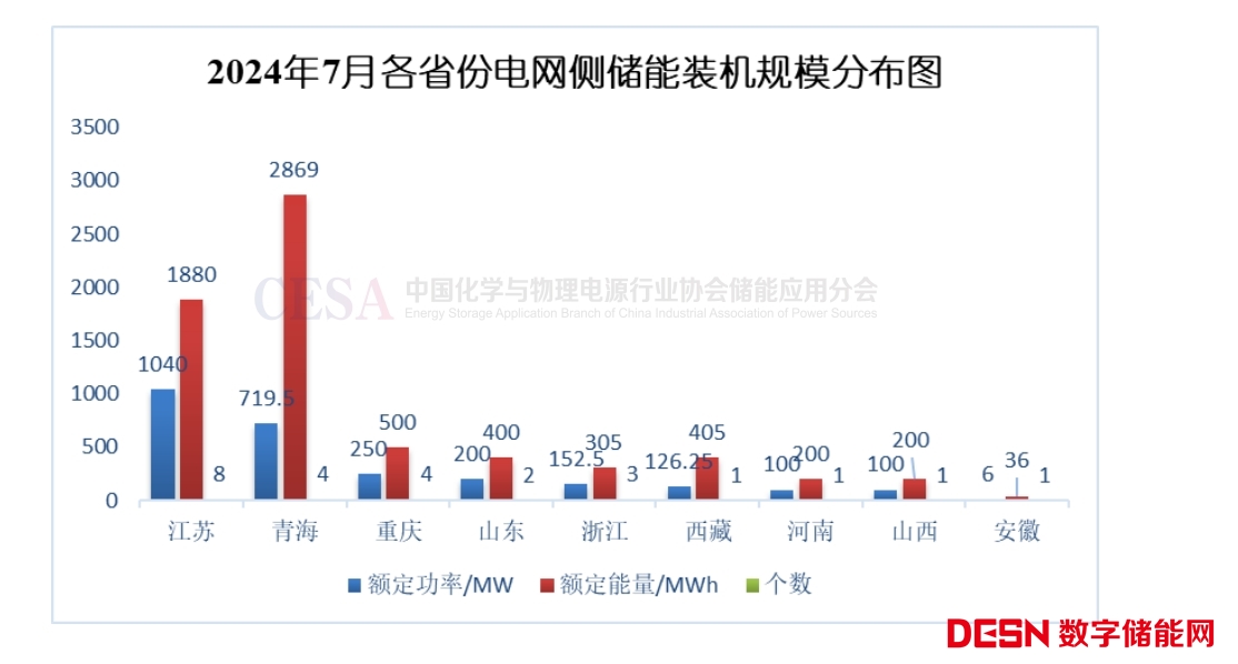 2024年7月,電網(wǎng)側(cè)儲(chǔ)能延續(xù)了6月的勢(shì)頭,共新增投運(yùn)項(xiàng)目25個(gè),總規(guī)模達(dá)2.694GW/6.795GWh,從規(guī)模來(lái)看,依舊以大型獨(dú)立儲(chǔ)能電站為主,百兆瓦及以上大型儲(chǔ)能項(xiàng)目共15個(gè),青海儲(chǔ)能項(xiàng)目?jī)?chǔ)能時(shí)長(zhǎng)為4h,其余省份儲(chǔ)能時(shí)長(zhǎng)以2h為主。從分布來(lái)看,投運(yùn)項(xiàng)目主要集中于江蘇、青海兩省,江蘇連續(xù)兩月電網(wǎng)側(cè)儲(chǔ)能投運(yùn)規(guī)模超1GW,7月新增投運(yùn)網(wǎng)側(cè)儲(chǔ)能項(xiàng)目8個(gè),其中6個(gè)為百兆瓦級(jí)大型儲(chǔ)能電站,總規(guī)模達(dá)1.04GW/1.88GWh,2024年投運(yùn)的電化學(xué)新型儲(chǔ)能項(xiàng)目規(guī)模躍居全國(guó)第一,有效保障全省電網(wǎng)安全穩(wěn)定運(yùn)行,為迎峰度夏電力保供提供重要支撐。同時(shí),青海海西州3個(gè)超200MW規(guī)模儲(chǔ)能項(xiàng)目集中投運(yùn),儲(chǔ)能時(shí)長(zhǎng)均為4h,建成目前國(guó)內(nèi)最大電網(wǎng)側(cè)儲(chǔ)能項(xiàng)目及單體容量最大共享儲(chǔ)能電站,項(xiàng)目的投運(yùn)能夠有效提升區(qū)域電力系統(tǒng)調(diào)峰能力和源網(wǎng)荷儲(chǔ)協(xié)同調(diào)度靈活性,提高電網(wǎng)的穩(wěn)定性,為促進(jìn)新能源規(guī)?;_(kāi)發(fā)和利用,推動(dòng)區(qū)域能源結(jié)構(gòu)優(yōu)化、生態(tài)環(huán)境改善和清潔發(fā)展,助力青海省國(guó)家清潔能源高地建設(shè),構(gòu)建新型電力系統(tǒng)和新型能源體系具有深遠(yuǎn)意義。