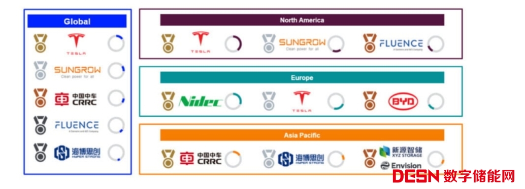 美國也出現(xiàn)了同樣的趨勢,特斯拉公司、陽光電源公司和Fluence公司仍然是儲能系統(tǒng)市場領(lǐng)導者,合計的市場份額從2022年的60%上升到72%。