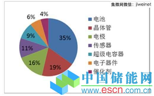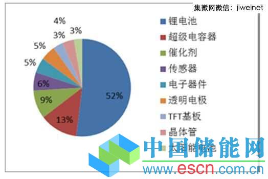 這是來(lái)自北京國(guó)之專利預(yù)警咨詢中心的數(shù)據(jù),從專利應(yīng)用分布可以看出,有鋰電(動(dòng)力電池)、超級(jí)電容器、微電子、觸摸屏、催化劑、太陽(yáng)能電池等。先看鋰電沒(méi)有大的突破。圖3.