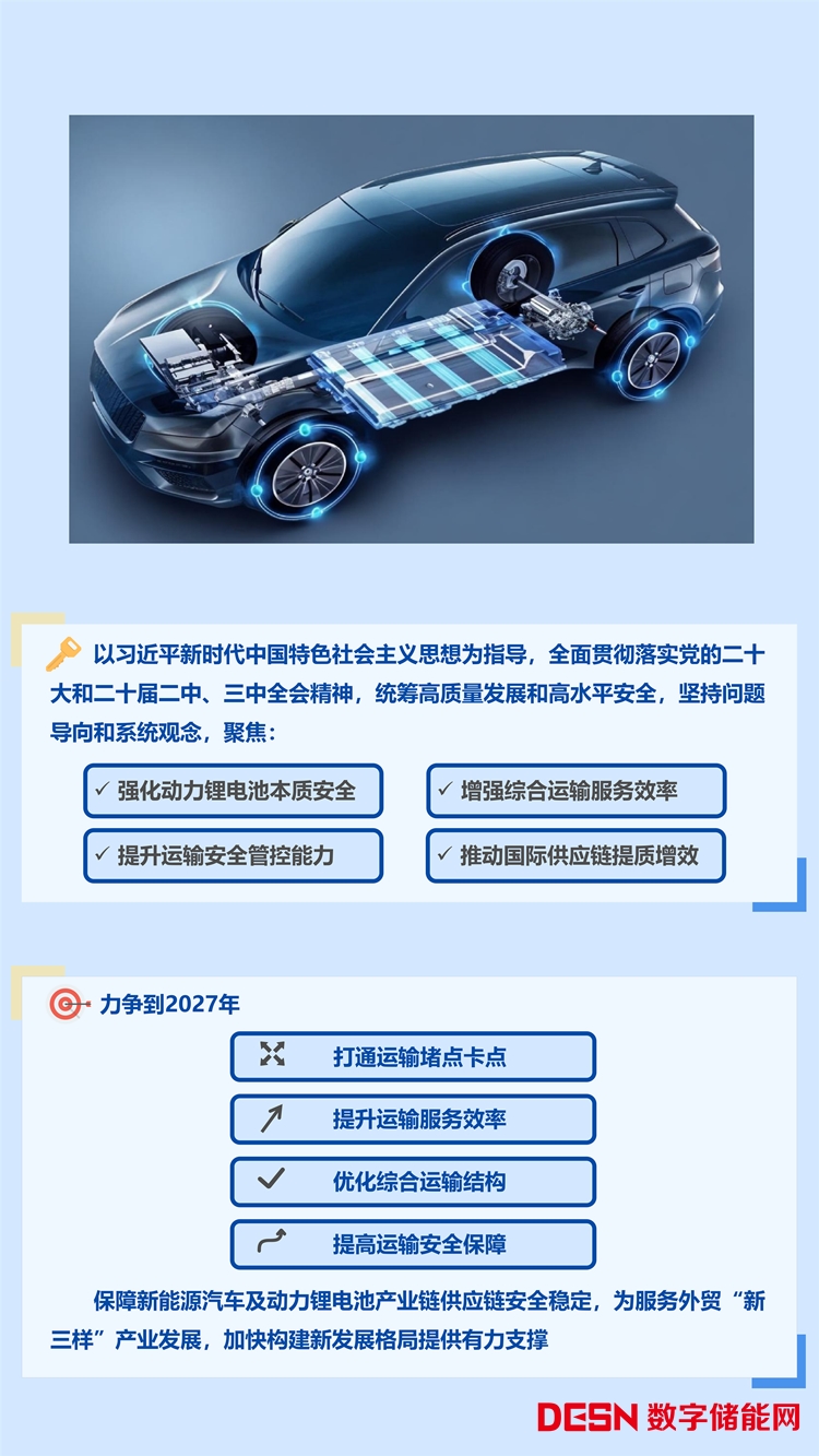 中國儲能網訊:動力鋰電池是支撐新能源汽車產業(yè)高質量發(fā)展的關鍵。為深入貫徹落實黨中央、國務院決策部署,加快提升新能源汽車動力鋰電池運輸服務和安全保障能力,促進新能源汽車動力鋰電池安全、便捷、高效運輸,切實增強新能源汽車和動力鋰電池產業(yè)競爭力,更好服務構建現(xiàn)代化產業(yè)體系,助力發(fā)展新質生產力,9月14日,交通運輸部會同工業(yè)和信息化部、公安部、商務部、應急管理部、市場監(jiān)管總局、國家鐵路局、中國民用航空局、國家消防救援局、中國國家鐵路集團有限公司等9個部門和單位聯(lián)合印發(fā)《關于加快提升新能源汽車動力鋰電池運輸服務和安全保障能力的若干措施》。