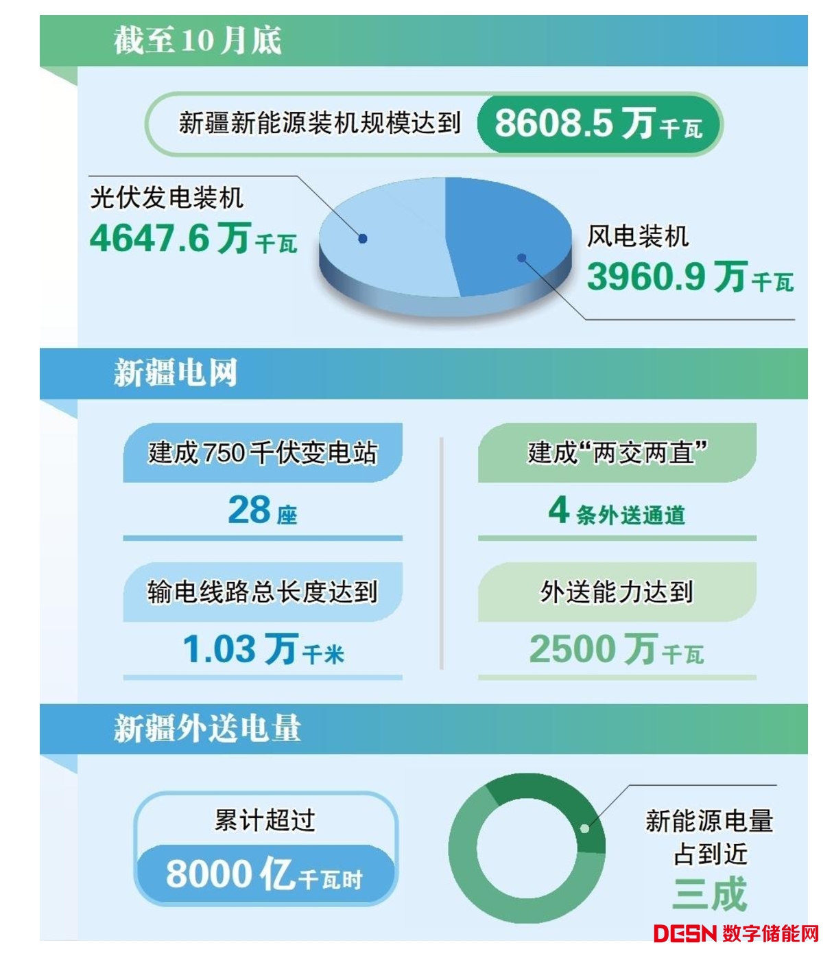作為“西電東送”的送電端,新疆建成“兩交兩直”4條外送通道,外送能力達(dá)到2500萬(wàn)千瓦,每年有超過(guò)300億千瓦時(shí)的綠色電能被輸送到21個(gè)省份,外送電量從2010年的3億千瓦時(shí)增長(zhǎng)至2023年的1262億千瓦時(shí)。自2010年“疆電外送”工程實(shí)施以來(lái),新疆外送電量累計(jì)超過(guò)8000億千瓦時(shí),其中新能源電量占到近三成。