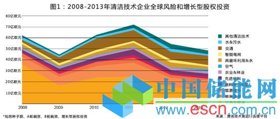 清潔技術風險資本仍主要是由能源相關技術(2013年51%)組成,盡管相比2010年的77%下降了很多,更多的能源要素是有關效率的,而不是可再生發(fā)電。這可以通過其他清潔技術領域獲得的好處來部分解釋(圖1所示),還有可再生能源泡沫經(jīng)濟后的前景(尤其是太陽能),除了美國和歐洲一些備受矚目的破產(chǎn)事件,自從2008年刺激消費的炒作和頂峰之后很多風險投資者已經(jīng)退出。