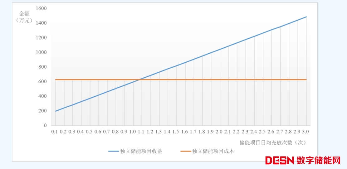 如以日均放電次數(shù)為變量,伴隨實際充放次數(shù)的提高,該項目年均利用效率和收入增幅明顯。該強制配儲單體項目成本主要為折舊費用,年均成本穩(wěn)定。根據(jù)測算可得,預計日均放電2.1次的情況下,該強制配儲單體項目可實現(xiàn)盈利。