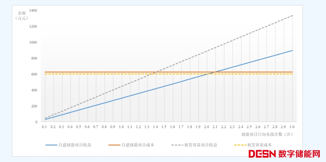 除自建配儲項目外,發(fā)電企業(yè)也可考慮租賃獨立儲能或共享儲能指標。在基礎(chǔ)條件假設(shè)情況下,增加新疆地區(qū)容量租賃成本300元/千瓦/年,峰谷電價差約0.37元/千瓦時的假設(shè)條件進行測算可得,預計日均放電1.4次的情況下,租賃儲能項目可實現(xiàn)盈利。