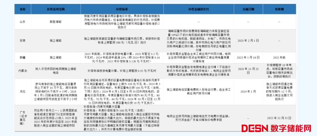 圖表2 國內(nèi)部分省份儲能電站容量補償政策