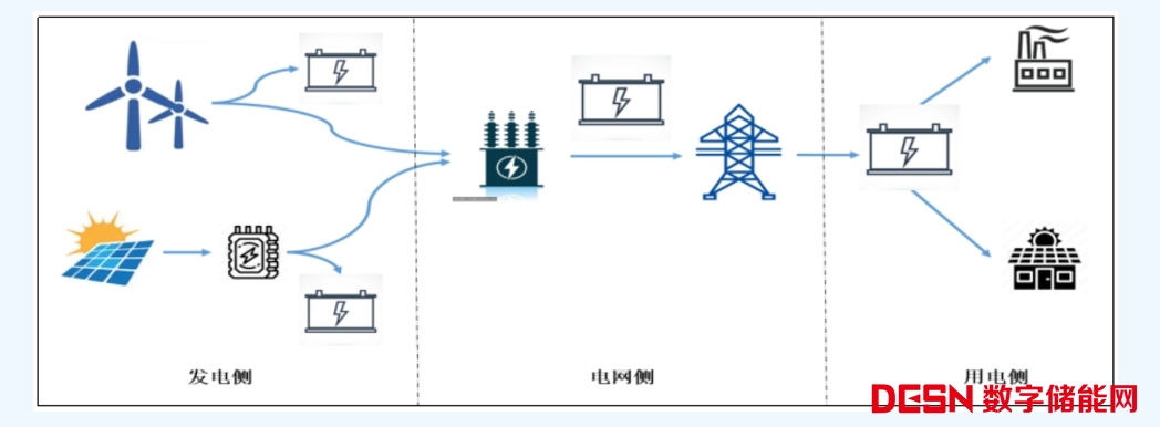新型儲能是指除抽水蓄能以外的儲能形式。抽水蓄能因資源條件限制以及建設(shè)周期較長等因素影響,規(guī)模增速有限。因此,隨著風光發(fā)電裝機規(guī)模的迅速擴大,新型儲能作為重要的靈活調(diào)節(jié)性資源,已成為構(gòu)建以新能源為主體的新型電力系統(tǒng)的重要支撐。在“源網(wǎng)荷儲”新型電力系統(tǒng)中,新型儲能系統(tǒng)可分別在電源側(cè)、電網(wǎng)側(cè)和用電側(cè)發(fā)揮作用。
