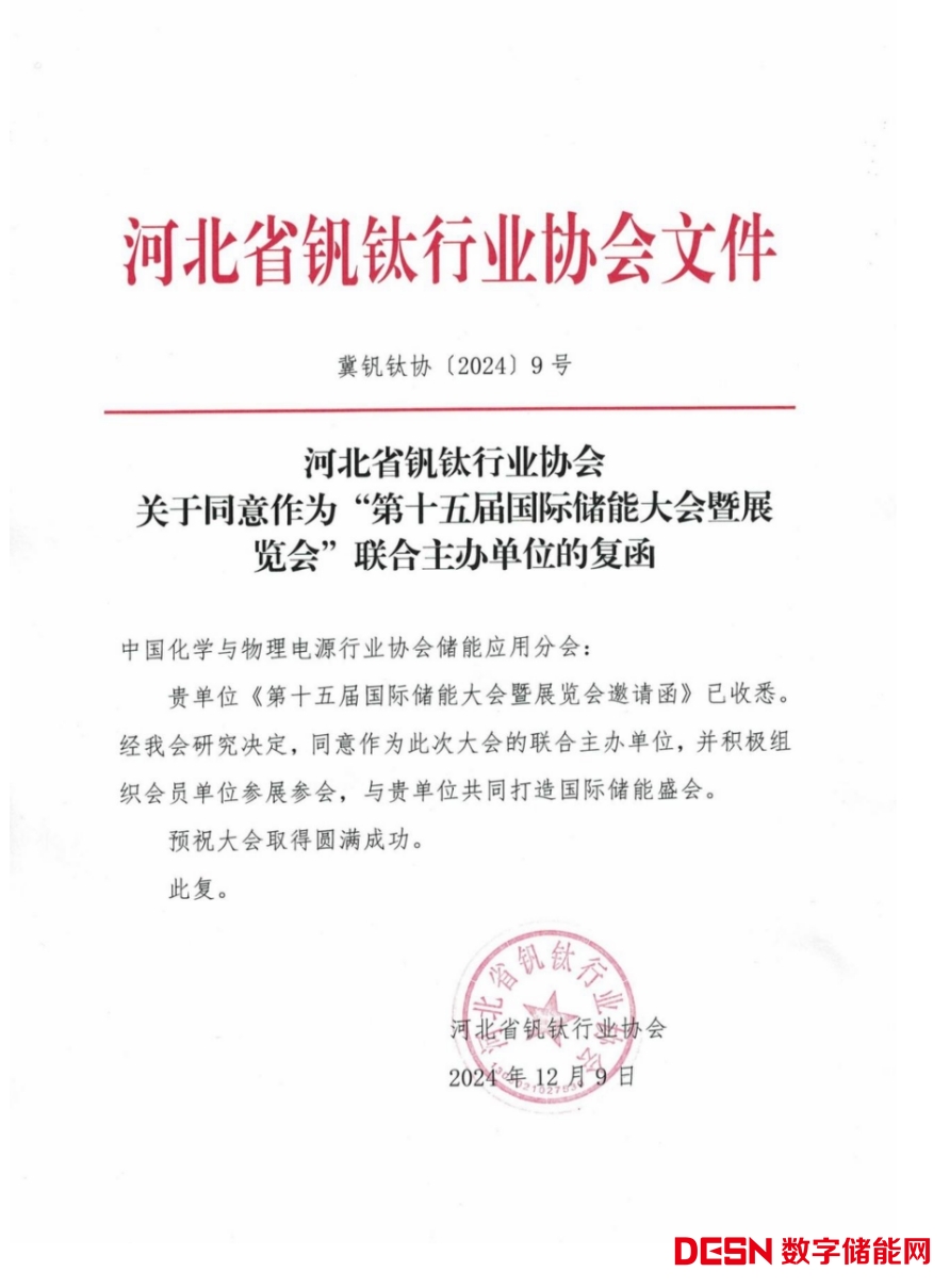 中國儲能網(wǎng)訊:近日,河北省釩鈦行業(yè)協(xié)會復函中國化學與物理電源行業(yè)協(xié)會儲能應用分會,同意作為第十五屆中國國際儲能大會暨展覽會(CIES2025)聯(lián)合主辦單位,并積極組織會員單位參展參會,與中國化學與物理電源行業(yè)協(xié)會儲能應用分會共同打造這場國際儲能盛會。