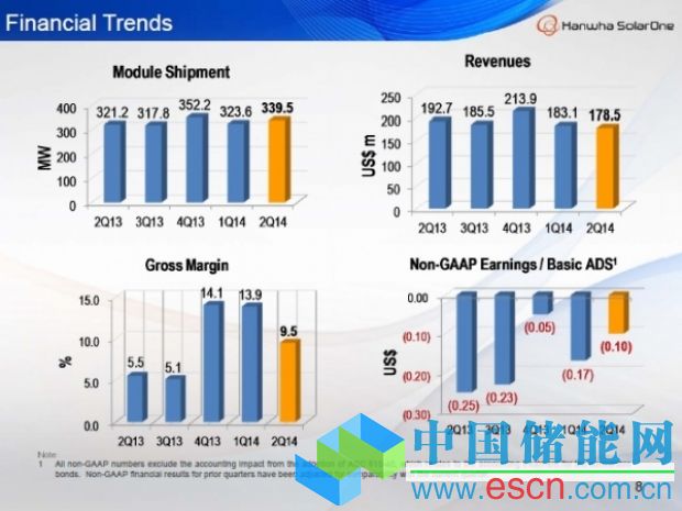 韓華新能源董事長(zhǎng)兼首席執(zhí)行官命南晟宇(Seong-wooNam)表示:“2014年第二季度呈現(xiàn)出貨量提高,以及我們的凈虧損大幅降低的態(tài)勢(shì)。我們的毛利率由較低的平均銷(xiāo)售價(jià)格壓低,反映出價(jià)格較高的歐盟市場(chǎng),尤其是英國(guó)的銷(xiāo)售比例減少,而相對(duì)價(jià)格較低的中國(guó)市場(chǎng)的比例提高。我們維持了我們?cè)谌毡镜膹?qiáng)勢(shì)地位,并且開(kāi)始對(duì)幾個(gè)較新的新興市場(chǎng)出貨。我們繼續(xù)維持嚴(yán)格控制運(yùn)營(yíng)支出?!?
