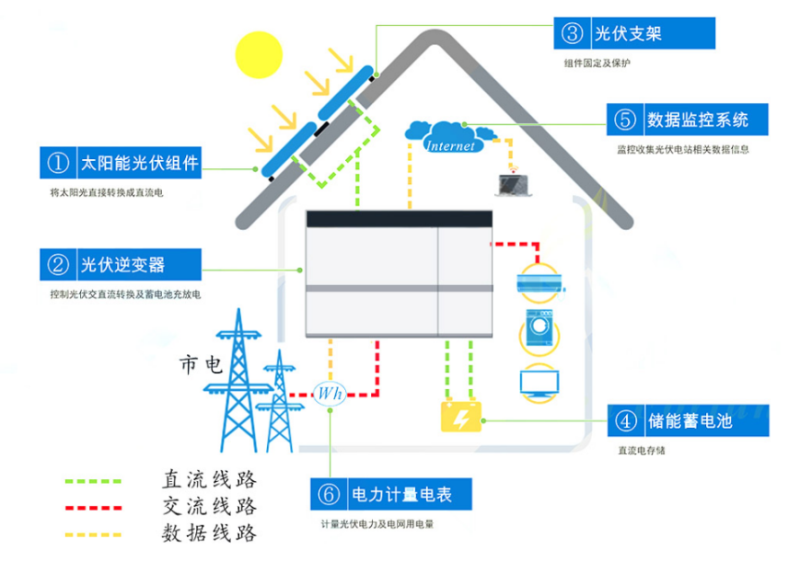 智慧戶用儲(chǔ)能系統(tǒng)由五大部分構(gòu)成:太陽(yáng)能電池陣列、并網(wǎng)逆變器、BMS管理系統(tǒng)、儲(chǔ)能電池、家庭交流負(fù)載。系統(tǒng)采用光伏與儲(chǔ)能系統(tǒng)混合供電,該套系統(tǒng)可實(shí)現(xiàn)并網(wǎng)運(yùn)行與離網(wǎng)運(yùn)行兩種模式,自給自足,能源產(chǎn)銷。光伏系統(tǒng)所發(fā)電能優(yōu)先供給戶用負(fù)荷并完成給儲(chǔ)電池的充電;受天氣或發(fā)電時(shí)段影響,當(dāng)光伏發(fā)電功率不足時(shí),由光伏系統(tǒng)、儲(chǔ)能系統(tǒng)和市電策略性的為負(fù)載供電;當(dāng)市電斷電時(shí),系統(tǒng)進(jìn)入離網(wǎng)狀態(tài),由儲(chǔ)能系統(tǒng)和光伏并網(wǎng)系統(tǒng)聯(lián)合供電。