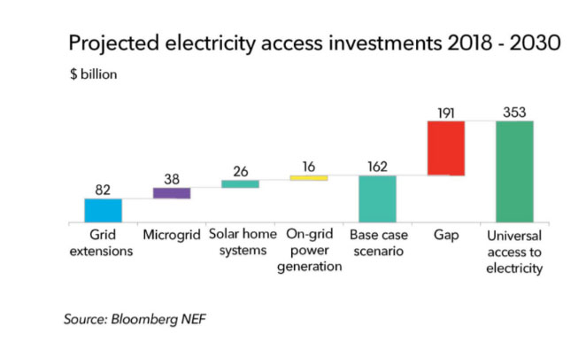 然而,到2020年中期,分布式技術(shù)將建立供應(yīng)鏈和更便宜的組件。此外,在那時,電網(wǎng)擴展和微電網(wǎng)之間的競爭在經(jīng)濟上可行的區(qū)域?qū)⒏佟;谶@些假設(shè),彭博社團隊認(rèn)為,到2030年,有2.38億戶家庭獲得電力供應(yīng),7200萬家庭將使用太陽能家庭系統(tǒng),3400萬家庭將從微電網(wǎng)獲取能源。