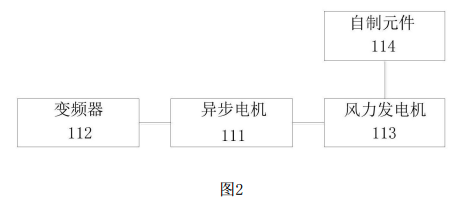請參閱圖2,可選地,在本實施例中,所述風(fēng)力發(fā)電單元110包括異步電機(jī)111、變頻器112以及風(fēng)力發(fā)電機(jī)113。所述異步電機(jī)111分別與所述風(fēng)力發(fā)電機(jī)113和所述控制單元160連接,所述變頻器112分別與所述異步電機(jī)111和所述控制單元160連接。其中,所述異步電機(jī)111的型號為TCO-12KW-1/6HP,所述變頻器112的型號為FR-E740-0.4K-CHT,所述風(fēng)力發(fā)電機(jī)113的型號為NE-100。