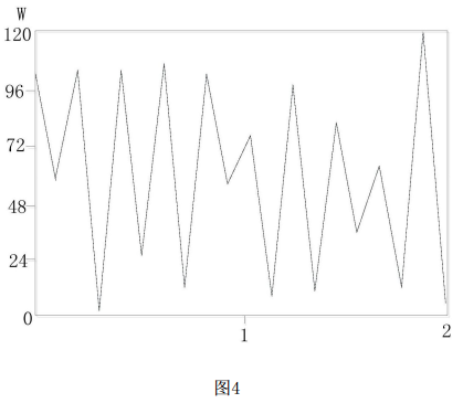 并且,PLC根據(jù)計算得到的瞬時電壓U和瞬時電流I,利用公式(4)計算得出風(fēng)力發(fā)電單元110的瞬時輸出功率。并將其計算出的瞬時功率實時發(fā)送至所述觸控單元180,以使所述觸控單元180進(jìn)行實時顯示。所述瞬時輸出功率P在所述觸控單元180上以曲線形式呈現(xiàn)。本實施例中,在具體實施時,得到的風(fēng)力發(fā)電單元110的輸出電壓U和輸出功率I的變化曲線如圖3和圖4所示。并且所述風(fēng)力發(fā)電單元110將產(chǎn)生的電能通過所述風(fēng)電充電控制器120輸送至所述風(fēng)能蓄電池進(jìn)行電能存儲??蛇x地,在本實施例中,所述風(fēng)電充電控制器120的型號為FW03-12,所述風(fēng)能蓄電池的型號為OT7-12。