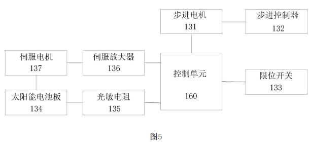 進(jìn)一步地,所述光伏發(fā)電單元還包括太陽能電池板、光敏電阻、伺服放大器以及伺服電機(jī),所述光敏電阻設(shè)置于所述太陽能電池板,所述伺服放大器分別與所述伺服電機(jī)和所述控制單元連接,所述伺服電機(jī)與所述太陽能電池板連接;