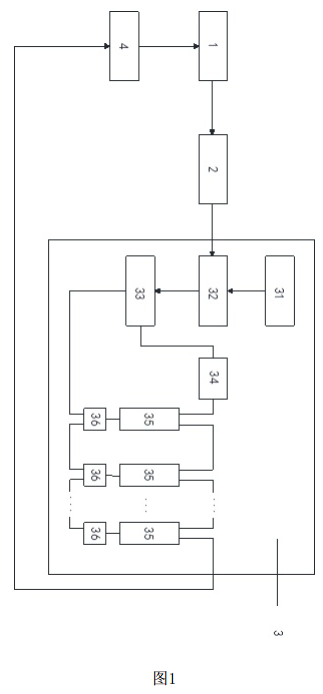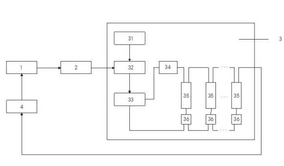 圖中:1-發(fā)電系統(tǒng),2-微電網中央控制單元,3-儲能系統(tǒng),31-能量管理系統(tǒng),32-儲能系統(tǒng)管理單元,33-電池組端監(jiān)測模塊,34-霍爾電流傳感器,35-儲能電池,36-電池在線監(jiān)測模塊,4-儲能變流器。