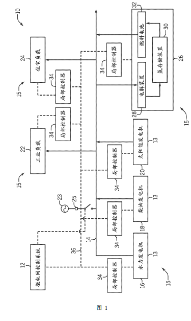 在圖示的實施例中,微電網(wǎng)10可包含各種功率發(fā)電機源13,比如例如水力發(fā)電機16、柴油發(fā)電機18和太陽能發(fā)電機20。在其他實施例中,微電網(wǎng)10可包含其他形式的可分派、不可分派或可再生發(fā)電源,比如例如組合熱和功率發(fā)電機或風(fēng)力渦輪機。由這些發(fā)電源產(chǎn)生的功率可經(jīng)由傳輸線14輸送給微電網(wǎng)10內(nèi)的負(fù)載。例如,在圖示的實施例中,由水力發(fā)電機16、柴油發(fā)電機18和/或太陽能發(fā)電機20產(chǎn)生的功率可經(jīng)由傳輸線14輸送給工業(yè)負(fù)載22或住宅負(fù)載24。在其他實施例中,產(chǎn)生的功率可經(jīng)由傳輸線14輸送給其他負(fù)載,例如市政當(dāng)局(例如,一個或多個房子、住宅區(qū)域、建筑、城市等)、車輛充電系統(tǒng)和/或商業(yè)設(shè)施(例如,一個或多個商店、制造廠、商業(yè)區(qū)等)。在某些實施例中,微電網(wǎng)10可在共同耦合25(例如,PCC 25)的點處通過斷路器耦合于主電網(wǎng)23(例如,公用事業(yè))。