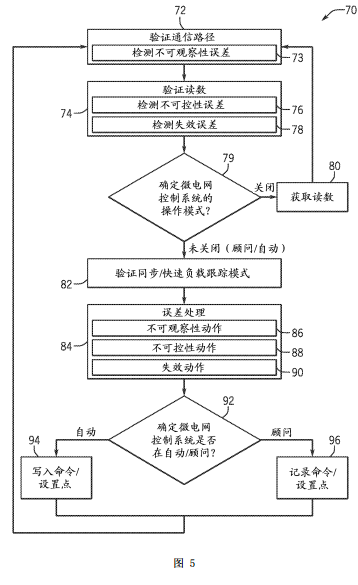 在驗證通信路徑36時,控制系統(tǒng)12可與微電網(wǎng)資產(chǎn)15通信,并且具體地,可從微電網(wǎng)資產(chǎn)15讀取信息。從微電網(wǎng)資產(chǎn)15讀取的信息可包含資產(chǎn)15的性能歷史或歷史統(tǒng)計、由資產(chǎn)15生成的功率量、由資產(chǎn)15傳送、存儲或接收的能量的量、資產(chǎn)15的操作模式或狀態(tài)等等。因此,方法70則包含驗證從微電網(wǎng)資產(chǎn)15收集的讀數(shù)(框74)。在該驗證過程期間,控制系統(tǒng)12可配置成監(jiān)測和檢測各種類型的不可控性和失效誤差。在一些實施例中,存在可被控制系統(tǒng)12檢測的五個類型的不可控性誤差(框76)。不可控性類型I指在線設(shè)備從控制系統(tǒng)12接收關(guān)閉命令但它未關(guān)閉時的情況。不可控性類型II指離線設(shè)備從控制系統(tǒng)12接收打開命令但它未接通時的情況。不可控性類型III指在改變設(shè)備或資產(chǎn)的操作模式方面的不成功嘗試。例如,柴油發(fā)電機18使每10秒從控制系統(tǒng)12接收命令保持在同步操作模式,但這并未發(fā)生。不可控性類型IV對應(yīng)于參考功率命令和來自微電網(wǎng)10的對應(yīng)實際讀數(shù)之間的差異超過某一水平時的情況。不可控性類型V指在控制系統(tǒng)12未處于自動操作模式時局部控制器34的非期望激活。在這類情形中,采用局部控制器34的優(yōu)化命令的傳達(dá)或?qū)懭脒^程(例如,優(yōu)化分派過程71)僅在控制系統(tǒng)12處于自動模式時發(fā)生。同樣,在控制系統(tǒng)12處于關(guān)閉或顧問模式時局部控制器34的操作未被預(yù)期。盡管描述五個類型的不可控性誤差,應(yīng)注意根據(jù)在微電網(wǎng)10內(nèi)操作的不同類型的微電網(wǎng)資產(chǎn)15可檢測或監(jiān)測任何數(shù)量的不可控性誤差。