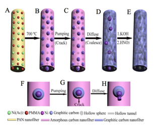 為了獲得同時(shí)具有高石墨化度和大比表面積的碳納米纖維,合作雙方經(jīng)過(guò)共同努力,利用納米鎳顆粒在無(wú)定形碳纖維基體中的催化石墨化原理,結(jié)合靜電紡絲和化學(xué)活化技術(shù),設(shè)計(jì)和制備了具有豐富石墨化隧道的“N-摻雜活化碳納米纖維”(ANHTGCNs)。該材料作為鋰離子電池負(fù)極材料時(shí),具有高達(dá)1560 mAh/g的比容量,是目前商用石墨負(fù)極的4倍多,同時(shí)表現(xiàn)出優(yōu)異的循環(huán)與倍率性能。這種通過(guò)控制金屬顆粒的擴(kuò)散路徑來(lái)調(diào)節(jié)無(wú)定形碳石墨化結(jié)構(gòu)的方法,為具有特殊石墨化結(jié)構(gòu)的一維碳納米材料制備提供了一條全新的思路。