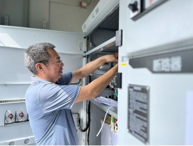 惠州市豪鵬科技有限公司員工在調(diào)試儲(chǔ)能項(xiàng)目設(shè)備。