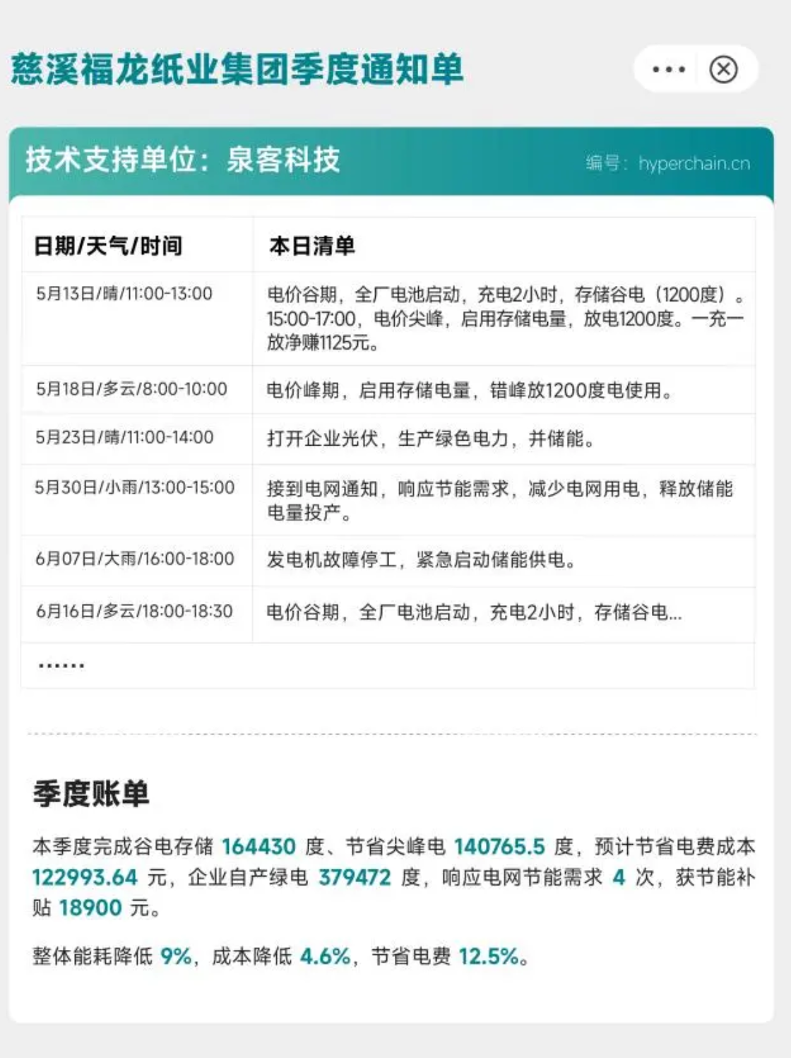 中國儲(chǔ)能網(wǎng)訊:“我們這種能耗企業(yè),一開機(jī)就是全廠作業(yè),能耗非常大,電費(fèi)也很貴,有時(shí)候出點(diǎn)故障一停工更是耽誤事兒,但是這個(gè)季度不一樣了!” 近日,慈溪福龍紙業(yè)集團(tuán)工程小隊(duì)的隊(duì)長陳師傅“曬”出了工廠最新的季度賬單,巨大的轉(zhuǎn)變令他喜出望外。
