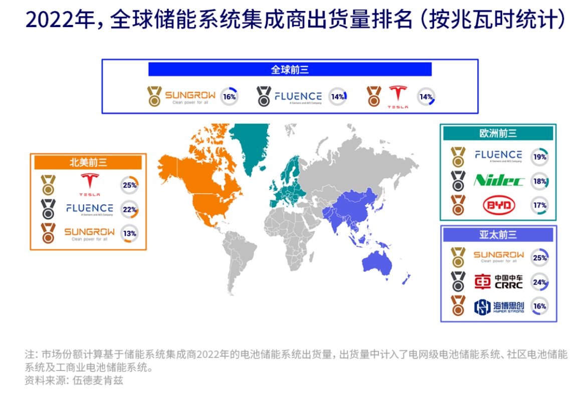 中國儲能網(wǎng)訊:據(jù)伍德麥肯茲最新研究報告顯示,2022年,電池儲能系統(tǒng)(BESS)集成商市場競爭日益激烈。全球前五大儲能系統(tǒng)集成商出貨量占電池儲能系統(tǒng)總出貨量(按兆瓦時統(tǒng)計)的62%。