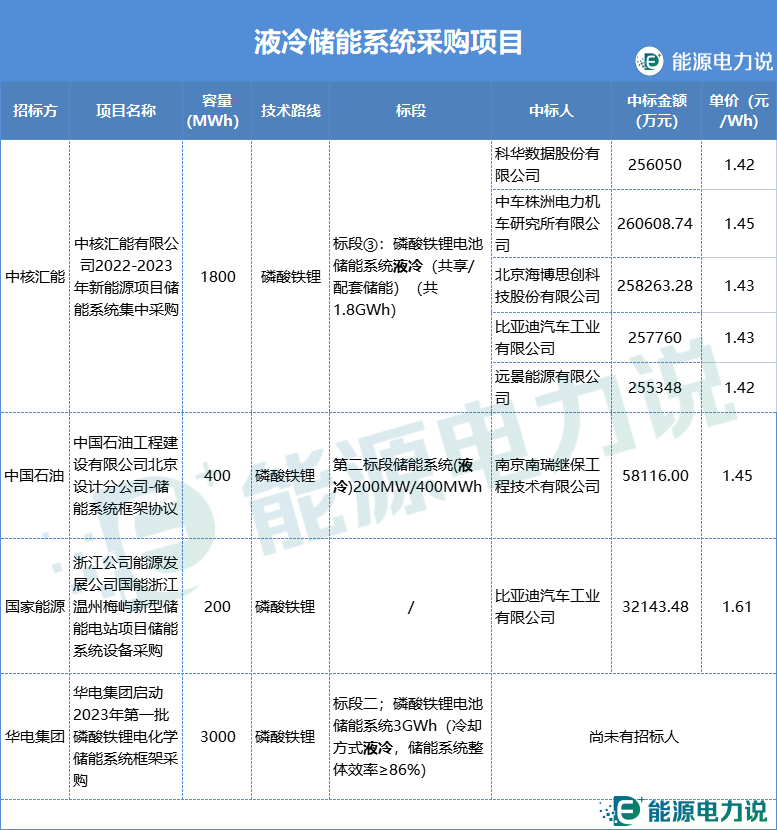 大型能源集團(tuán)已經(jīng)開(kāi)始液冷儲(chǔ)能系統(tǒng)的招標(biāo),據(jù)統(tǒng)計(jì),中核集團(tuán)、中石油、國(guó)家能源集團(tuán)、華電集團(tuán)等公司進(jìn)行了液冷儲(chǔ)能系統(tǒng)采購(gòu)項(xiàng)目,液冷系統(tǒng)規(guī)模約5.4GWh,采購(gòu)單價(jià)在1.42元/Wh-1.61元/Wh。